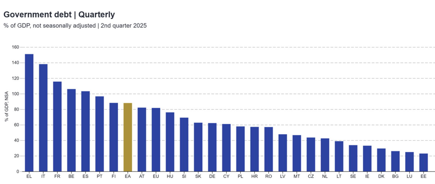 Comparing government debt levels (% of GDP) across EU member states remains a complex exercise. Countries such as Greece (151.2%) and Italy (138.3%) continue to display some of the highest debt ratios in the Union, whereas Luxembourg (25.1%) and Estonia (23.1%) sit at the opposite end of the spectrum with significantly lower levels. This disparity illustrates both the diversity and the resilience of the EU architecture. It is equally important to remember that debt is only one among many indicators monitored by EU economists and policymakers when assessing fiscal stability. As a reference point, the latest published Eurostat figures for Q2 2025 provide a clear snapshot of government debt as a percentage of GDP across the Union.