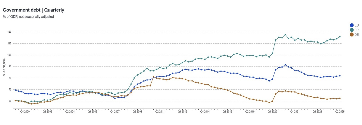 In recent years, the old narrative of a fiscally fragile Southern Europe versus a fiscally robust Northern Europe is losing ground as even the large Northern economies are now under strain. For instance, France, long considered a core European pillar, now posts a government debt-to-GDP ratio above 115 % accompanied by recurring political instability that places its governing coalitions under frequent pressure. Similarly, Germany, historically among the most fiscally prudent euro-area economies, is projected to see its debt burden rise sharply over the coming years