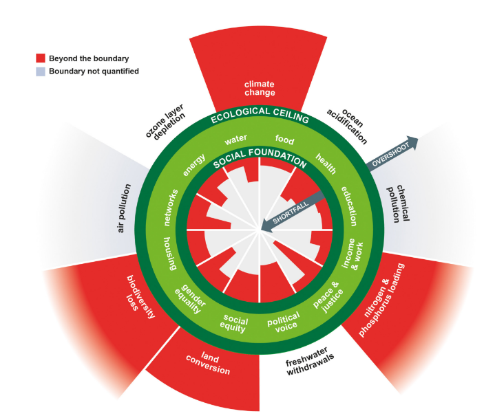 The hole at the Doughnut’s centre reveals the proportion of people worldwide falling short on life’s essentials, such as food, water, healthcare and political freedom of expression – and a big part of humanity’s challenge is to get everyone out of that hole. At the same time, however, we cannot afford to be overshooting the Doughnut’s outer crust if we are to safeguard Earth’s life-giving systems, such as a stable climate, healthy oceans and a protective ozone layer, on which all our wellbeing fundamentally depends.
