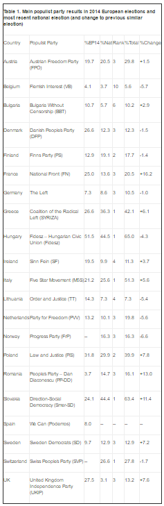 Table 1 lists the most important populist parties in Europe today – only the most successful party in each country is included. The third column gives the electoral result in the most recent European election of May 2014, which vary from 51.5 percent to 3.7 percent of the vote – note that countries without a successful populist party are excluded (e.g. Luxembourg, Portugal or Slovenia). On average, populist parties gained some 12.5 percent of the vote in the last European elections; not insignificant, but hardly a “political earthquake” as the international media claimed.