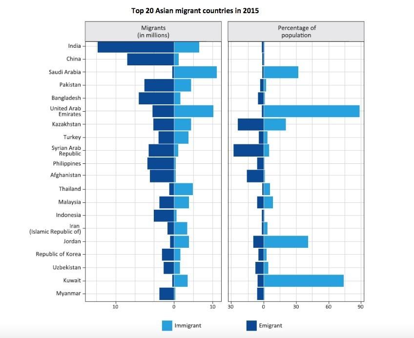 The oil-rich economies of Saudi Arabia and the United Arab Emirates have the largest number of immigrants in the Middle East and Asia in terms of total numbers.