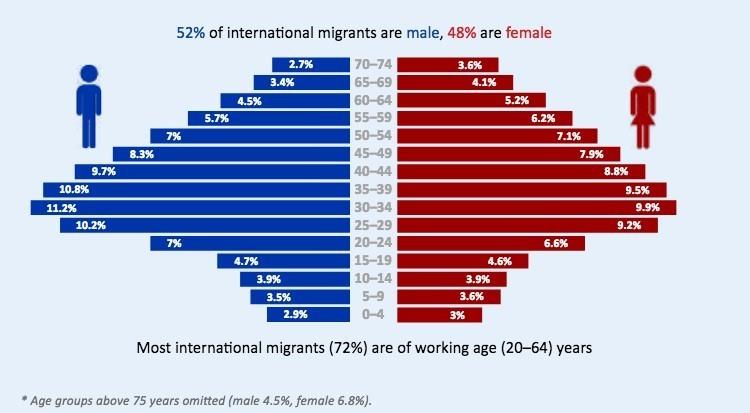 Despite high-profile coverage of child refugees from places like Syria, the data shows that most migrants are of working age. This reflects the fact that the majority of migration is for economic reasons.