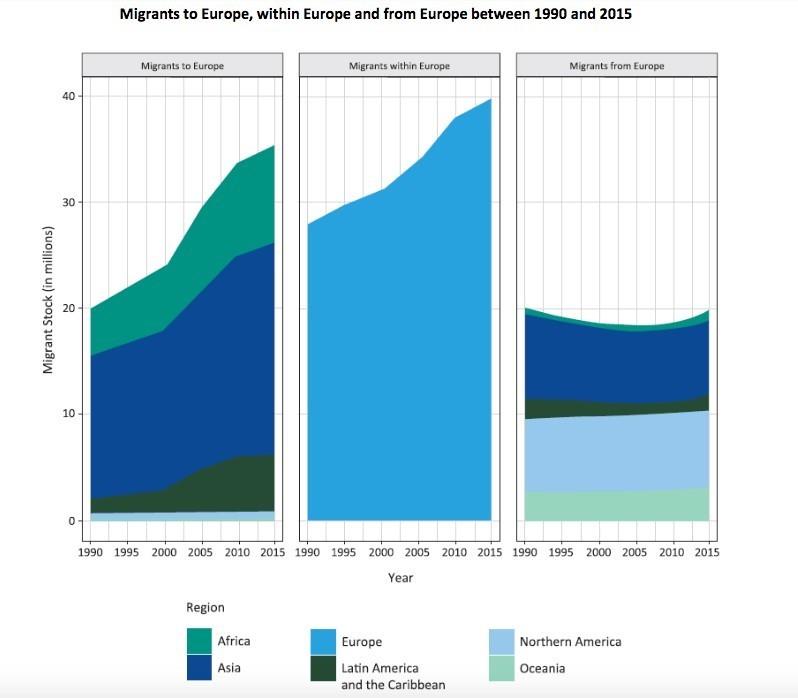 While migrants moving into Europe are fewer than those Europeans moving within the region, they still accounted for some 35 million in 2015.