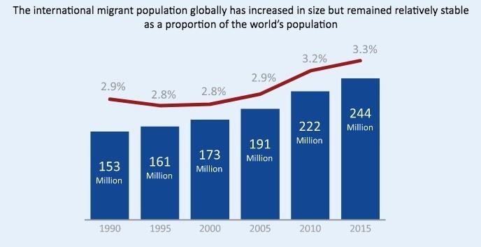 While the total number of people migrating globally has increased by nearly two thirds over the past 25 years, these numbers as a proportion of the total global population have remained relatively stable – at around 3%.