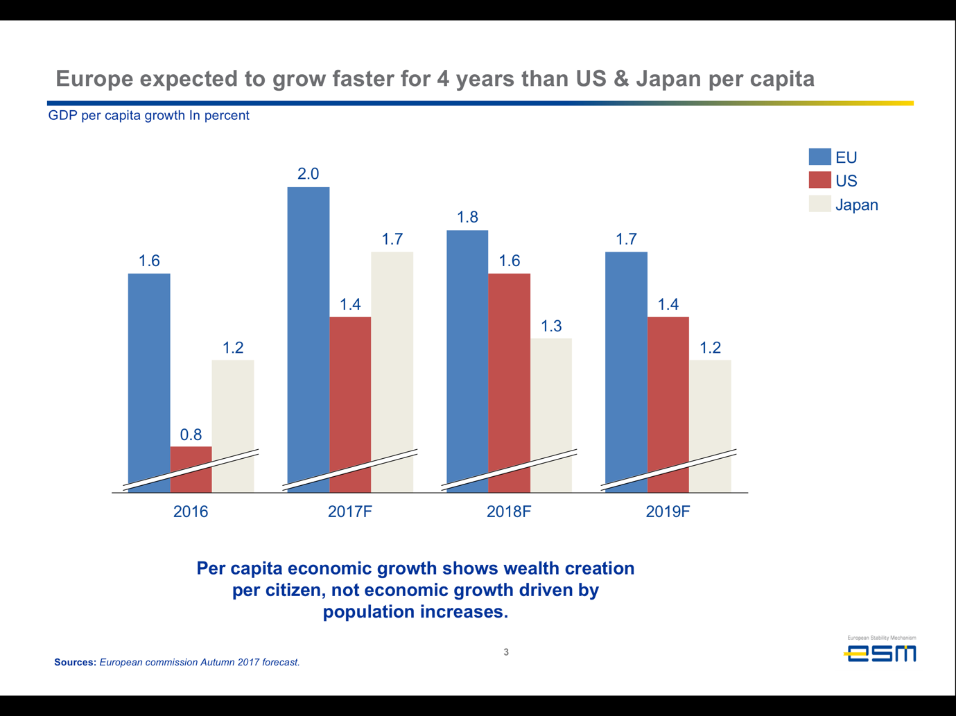 But what is even more important is per-capita growth - what people feel in their pocket. Here, things look even better. The autumn forecasts from the European Commission predict that the EU will continue to outpace the US this year, and in 2018 and 2019. It already did so in 2016. If the forecasts hold, the EU will have outgrown the US in GDP per capita terms four consecutive years in a row.