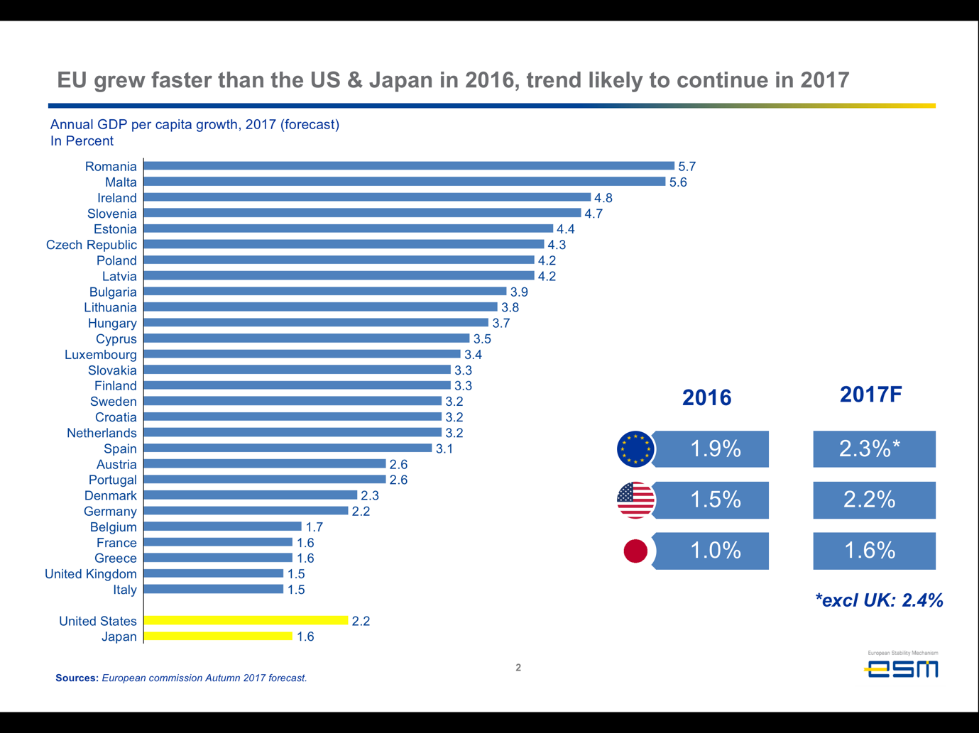 The EU outperformed the US in terms of GDP growth in 2016. It looks like this will be the case again in 2017.