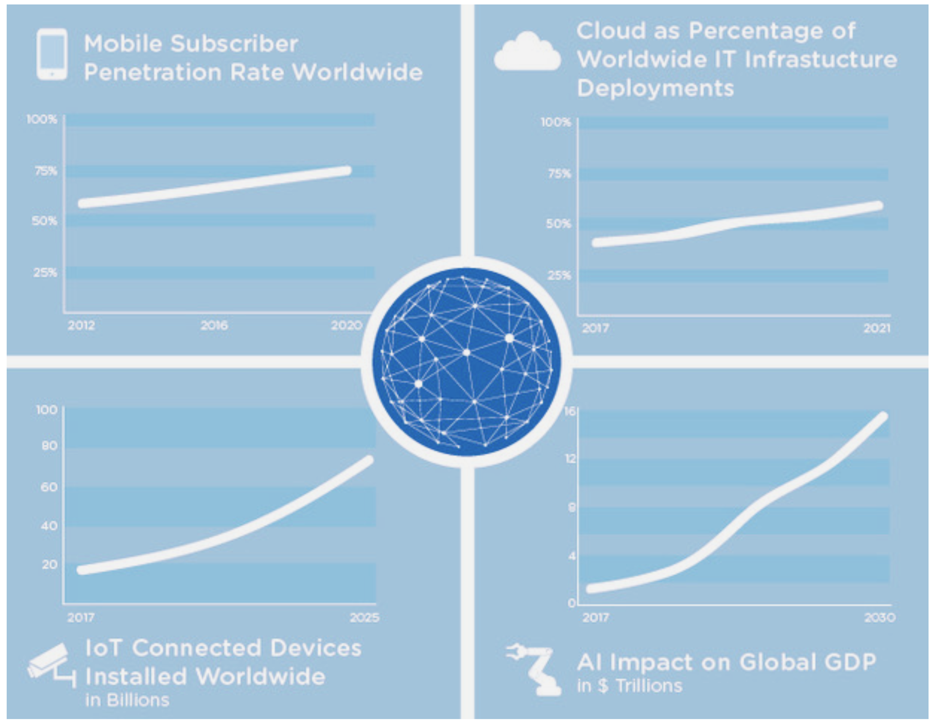Deep-learning AI enables us to mine massive amounts of data in real-time and to use those insights to dramatically accelerate academic discovery and create entirely new business models. And the IoT connects the physical and digital worlds, bringing technology into every dimension of human progress. As these innovations quickly mature and build on one another, they are reshaping every aspect of society, from healthcare to education to transport and financial inclusion.