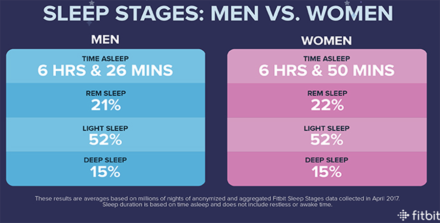 The results show that men and women get around the same mix of light and deep sleep on any given night. However, women sleep for 25 minutes longer than men.