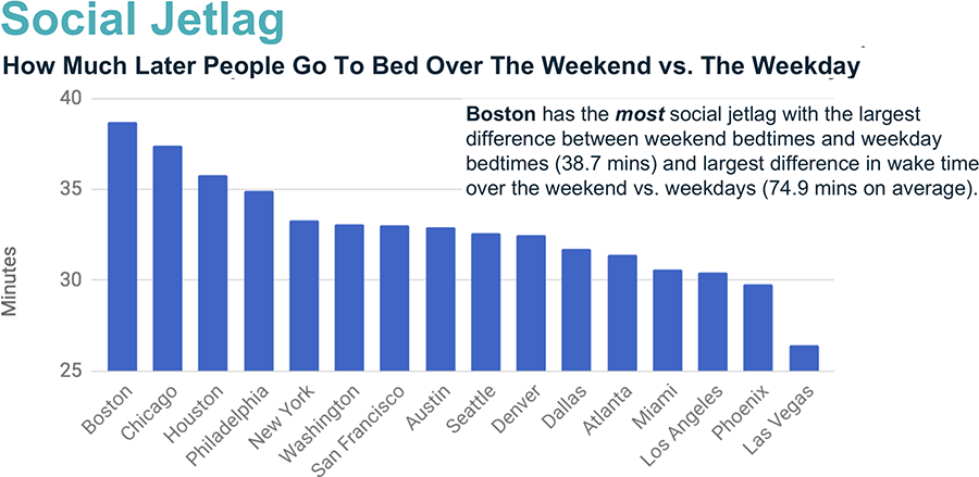 Bostonians were the worst social jet lag culprits, while people in Las Vegas had the smallest difference between weekday and weekend bedtimes.