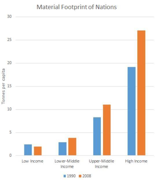 However, material consumption is not evenly distributed across the human population. People in rich nations consume vastly more than their counterparts in the rest of the world, according to the most recent data. The average resident of the average high-income country burns through 28 tons of stuff every year. By contrast, people in low-income countries use less than two tons every year. Indians consume 3.6 tons. People in upper-middle-income countries such as China and Brazil consume about 12 tons. That’s right on the world average, and less than half the amount consumed by their counterparts in nations such as Britain and the US.