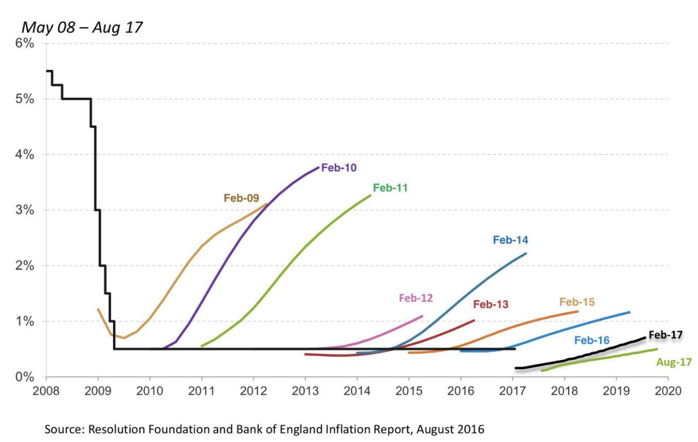 Unfortunately, this is not new. Since 5 March 2009 (more than nine years ago), when interest rates were lowered to 0.5 percent in the U.K., we have not seen much action despite all the talk and promises of higher interest rates. And inaction of interest rates has come mostly as a surprise as projections on interest rates were always much higher than what was later delivered by the central bank (see image below).