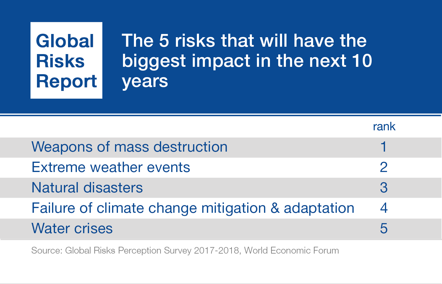 These extreme weather events underscore the findings of the World Economic Forum’s 2018 Global Risks Report, which identified global risks with the highest likelihood and impact over the coming decade.