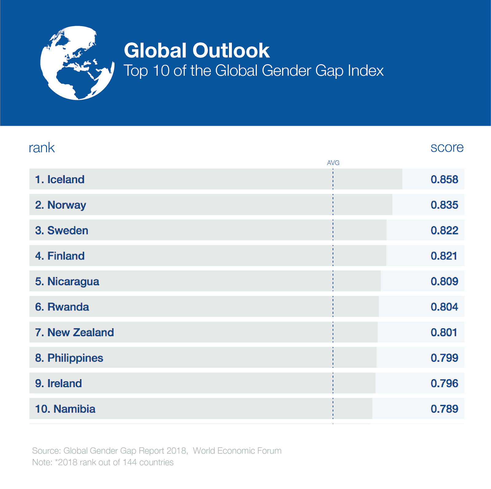 Iceland tops the index for the 10th year in a row, having closed more than 85% of its overall gender gap. The top four countries are all Nordic nations: with Norway, Sweden and Finland coming second, third and fourth respectively.