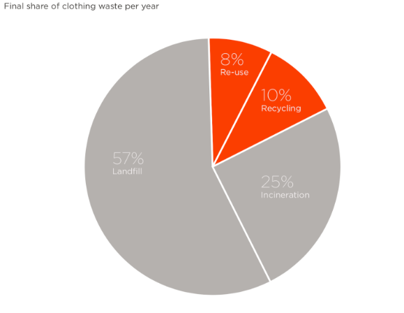 According to the sustainable fashion industry body Common Objective, 57% of all discarded clothing ends up going to landfill, while “35% of all materials in the supply chain end up as waste before a garment or product reaches the consumer”.
