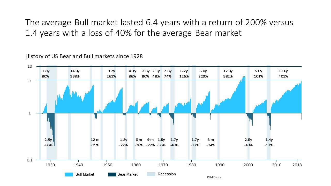 The following chart shows the calculation of bull and bear markets since 1928. A bear market is defined as a period during which stocks fall more than 20 percent of their previous high. A bull market is defined as a market where stocks increase by more than 20 percent from their previous low.