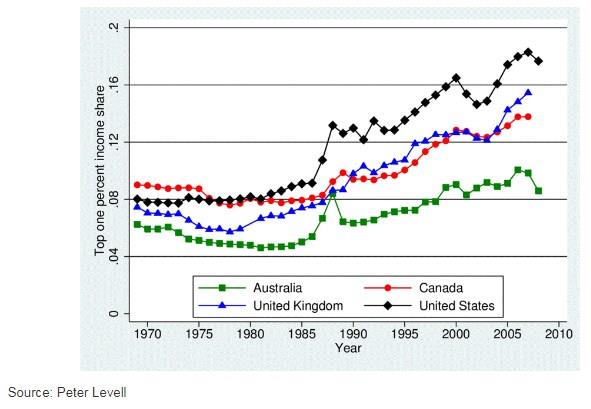 There is a big problem with this theory, however. The general trend towards rising inequality, resulting in more and more goodies jammed into the already bulging pockets of a few “superstars”, is not limited to the United States. It is distinctly seen, though to a lesser extent, in Australia, Canada, China and the United Kingdom among others. Unlike the US, these countries do not have a multi-billion-dollar per year lobbying industry aimed at influencing public policy for the benefit of corporate clients.