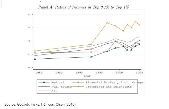 Income gaps between occupations have also grown globally. The difference in wages between, say, an engineer and a schoolteacher is significantly greater now than it was in 1980. Even within certain professional-class occupations paying well above average, e.g. physicians and college professors, the distance between rungs at the very top of the income ladder has increased. In these sectors, inequality has infiltrated the top one percent, elevating the mega-elite 0.1 percent above the rest.