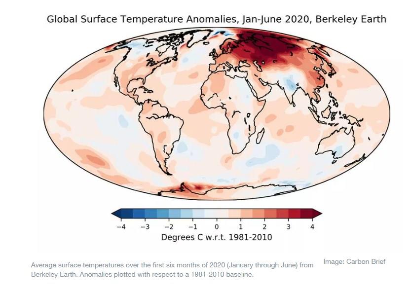 The map below shows the distribution of temperatures in the first six months of 2020 across the Earth’s surface. The Siberia region has been strikingly warm so far this year, with many areas 7C warmer than the global average. Europe has also experienced unusual warmth of about 2C above average. Other unusually warm locations include East Asia, Northern Europe and parts of Antarctica.
