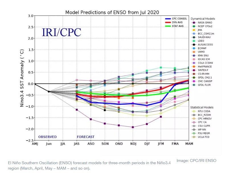 The first half of 2020 saw neutral El Nino conditions, likely having little impact on temperatures, though there is evidence in the last two months of a mild La Nina developing. Prediction models suggest that the La Nina conditions will persist for the second half of the year, though most models predict only a relatively modest La Nina event through to the end of 2020.