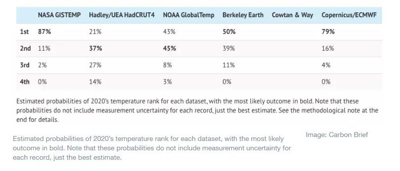 The probability of where 2020 will fall on the leaderboard of warmest years based temperatures so far this year is shown in the table below.