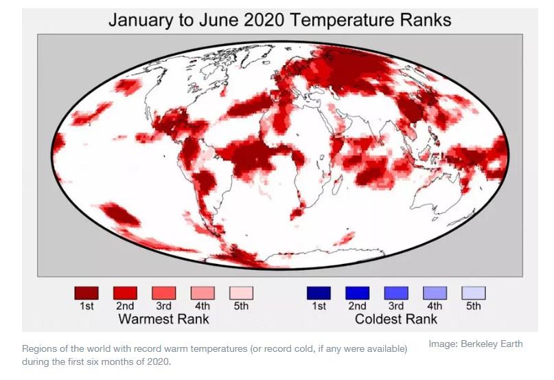 Global surface temperatures have been exceptionally warm over the first half of 2020, tying with the record warmth seen in 2016. This is particularly remarkable because El Nino conditions have been largely “neutral” in 2020 to-date, unlike 2016 which was considerably boosted by an extremely strong El Nino event in the tropical Pacific.