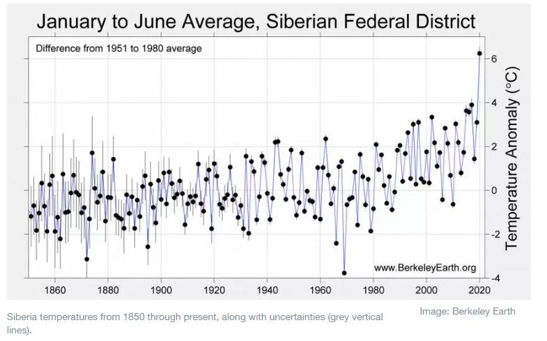 The figure below shows temperatures for the first six months of the year for the Siberia region from 1850 through present. The value for 2020 represents a remarkable departure from anything previously seen for the region. It reflects a combination of a long-term, human-caused warming trend – Siberia is one of the fastest warming regions on Earth – and an extremely rare heat event likely due to natural variability.