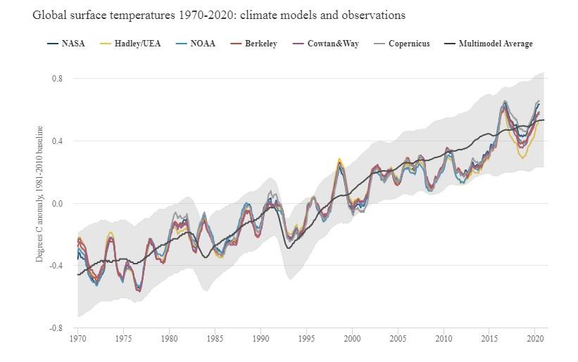 The figure below shows the range of individual models forecasts featured in the Intergovernmental Panel on Climate Change’s (IPCC) fifth assessment report – known collectively as the CMIP5 models – between 1970 and 2020 with grey shading and the average projection across all the models shown in black. Individual observational temperature records are represented by coloured lines.