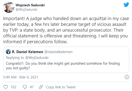 The attack on the judiciary is nonstop. Here is a tweet written on March 6 by Wojciech Sadurski, a leading Polish constitutional lawyer who is PiS’s bete noir and now lives outside his country: