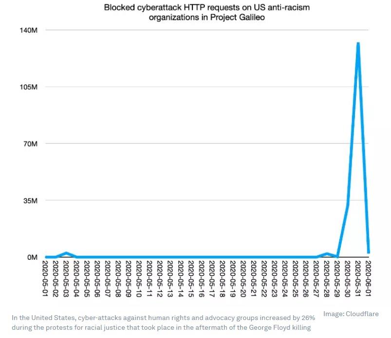 For example, in the United States, cyber-attacks against human rights and advocacy groups increased by 26% during the protests for racial justice that took place in the aftermath of the George Floyd killing. Throughout May and June 2020, the website security firm Cloudflare blocked 135,535,554,303 online requests to perform distributed denial of service (DDoS) attacks or break into websites and apps (that’s ten times more blocked requests per second than Google’s typical entire search volume over the same period).