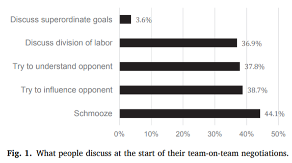 However, discussing superordinate goals is not what negotiators typically do. When we asked professionals pursuing an MBA what they generally do at the start of a team-on-team negotiation, only 4 percent mentioned discussing superordinate goals with the other team (Fig. 1).